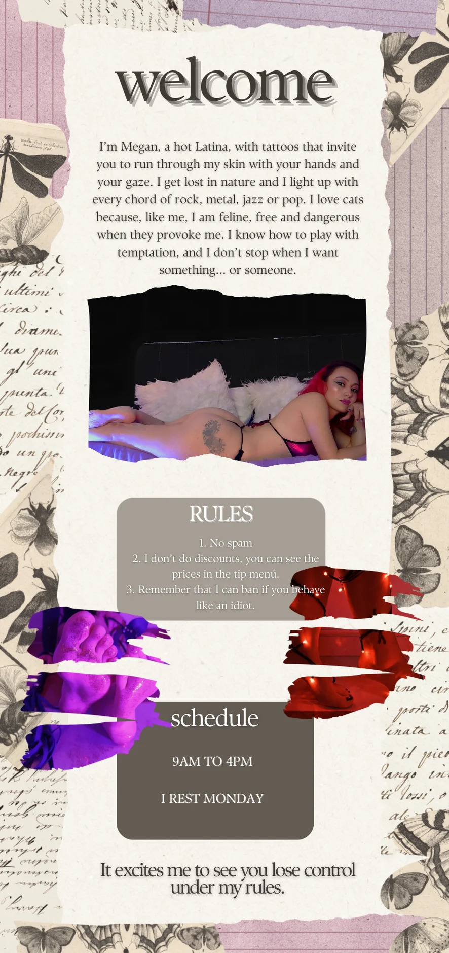 情婦, 打屁股, 情色舞蹈, 駱駝趾, 胸衣, 皮革, 髒話, 乳膠, 性愛玩具, 狗爬式, 指交, 假陽具或按摩棒, 脫衣舞, 羞辱, 情境扮演, 堵嘴, 精油表演, 戶外, 戀足癖, 臉部, 吸煙, 深喉, 乳頭玩具, 自慰, 乳交, 絲襪, 高跟鞋